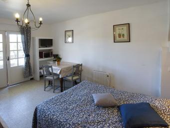 Il est équipé d'un grand lit 2 places, d'une penderie, table intérieure, chaises et TV avec TNT.