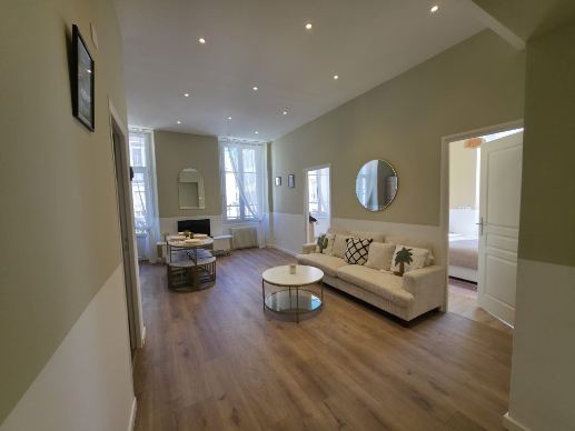 Un salon lumineux avec canapé confortable, télévision et coin repas, offrant un espace agréable pour se détendre après une journée de visite.