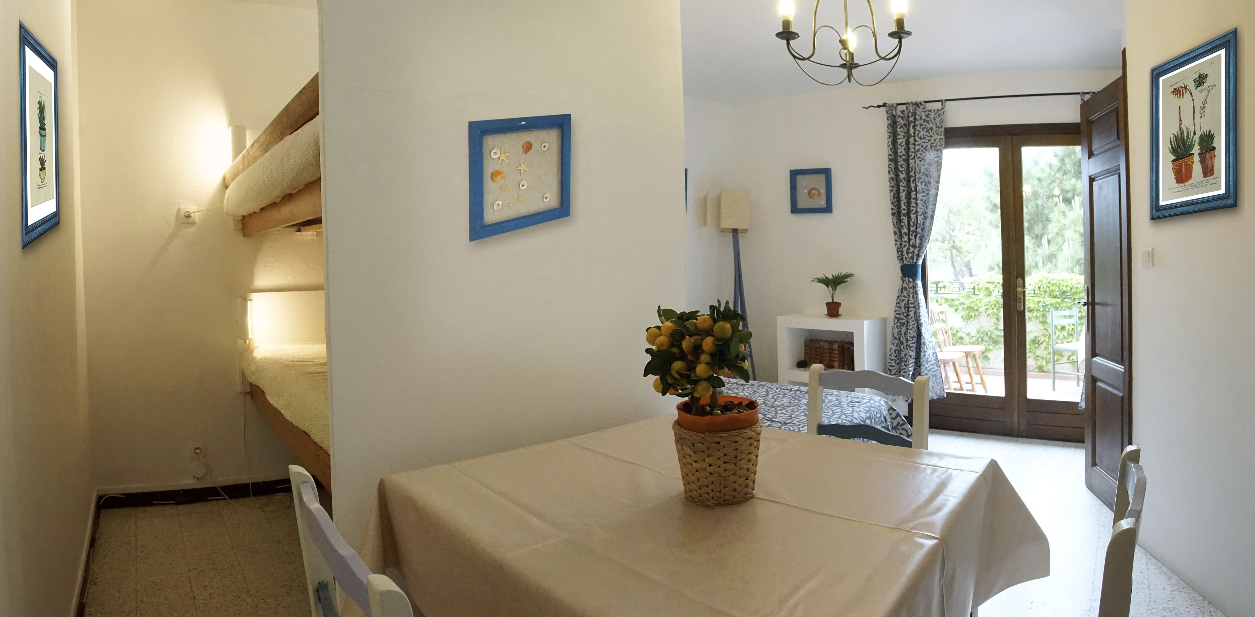 Il est équipé d'un grand lit 2 places, d'un lit superposé, d'une penderie, table intérieure, chaises et TV avec TNT.
